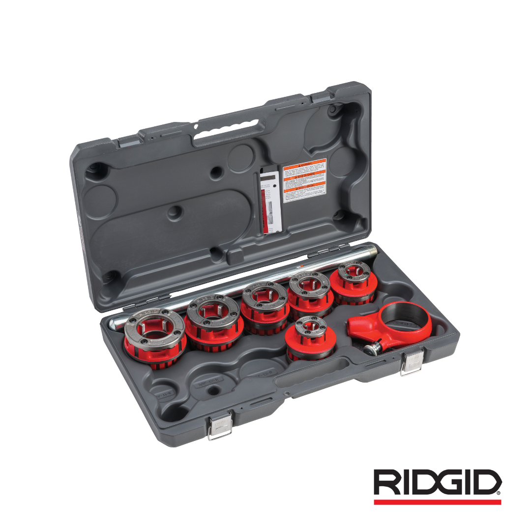 - Todos los juegos y roscadoras constan de cabezales roscadores, conjunto de trinquete, mango de trinquete y dados de roscado de aleación.